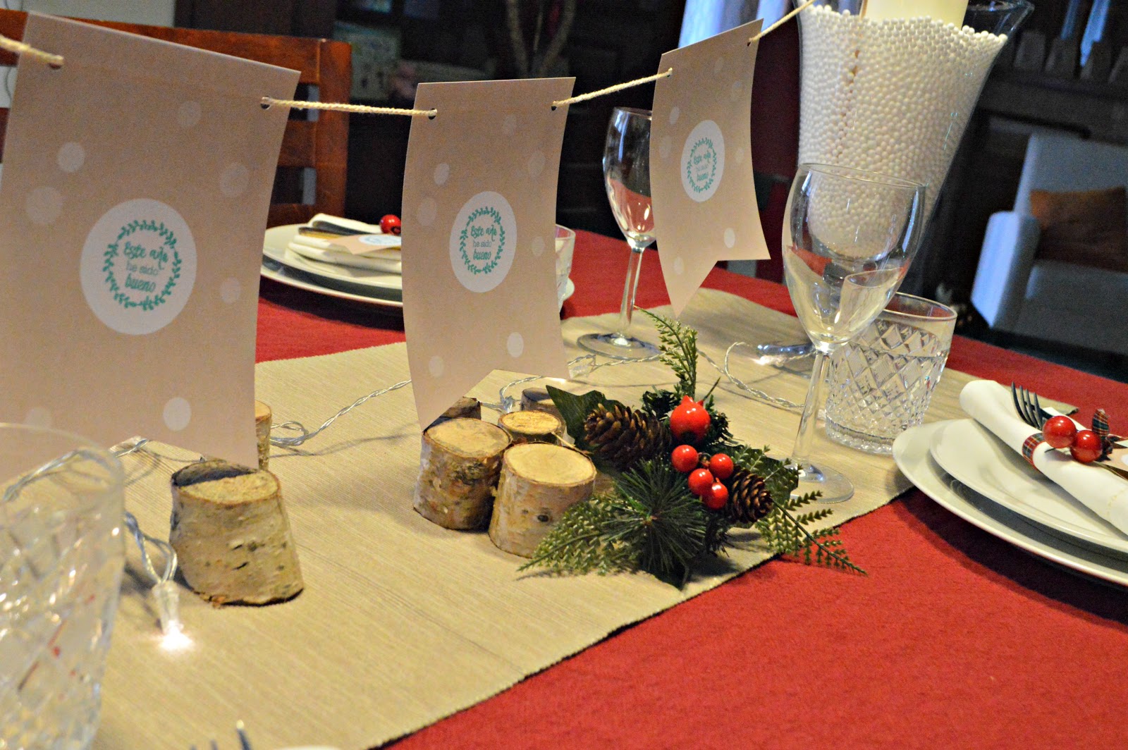 Para la decoración elegí unos colores típicos navideños y un toque natural que pegase con los colores de las banderolas y los toppers que me enviaron desde handbox. Así que beige, rojo y blanco fueron los seleccionados.